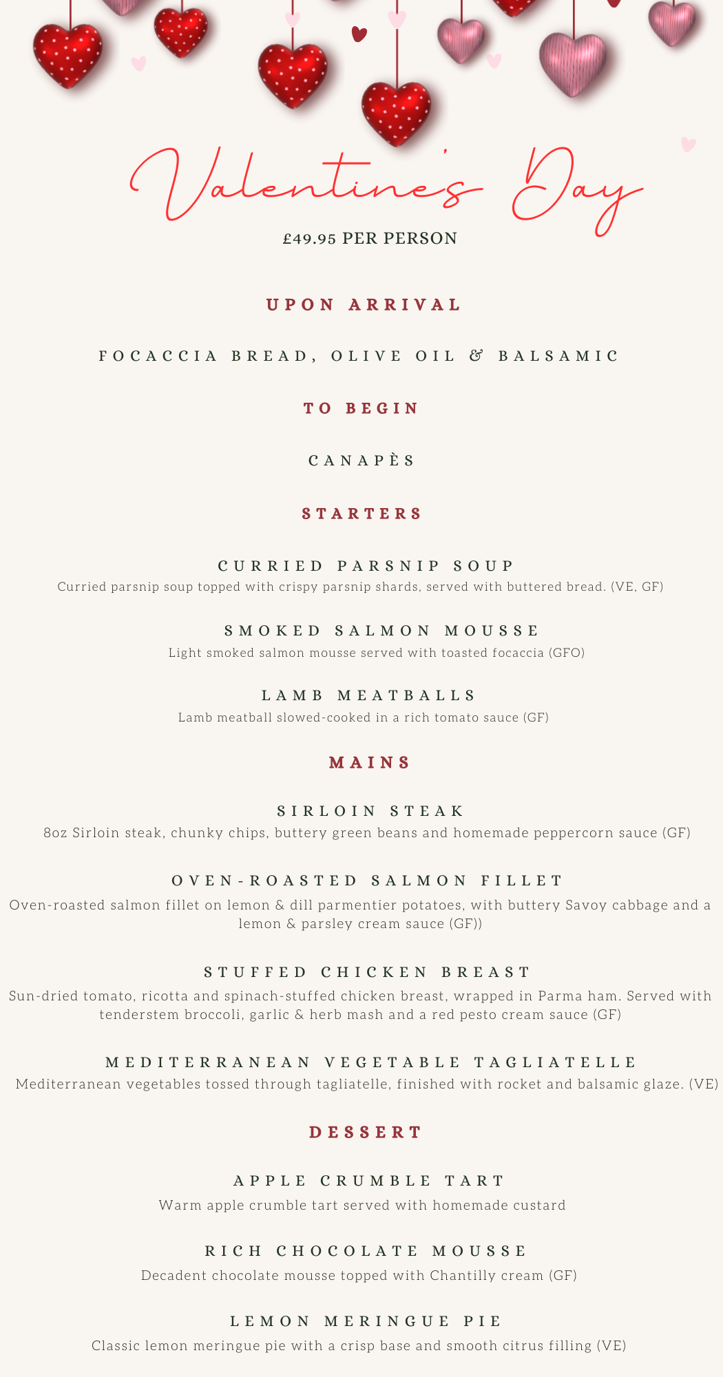 Indulge in a £49.95 five-course Valentine’s menu, perfectly paired with a complimentary glass of Prosecco on arrival. Our chefs have crafted a decadent dining experience designed to be savoured from start to finish.